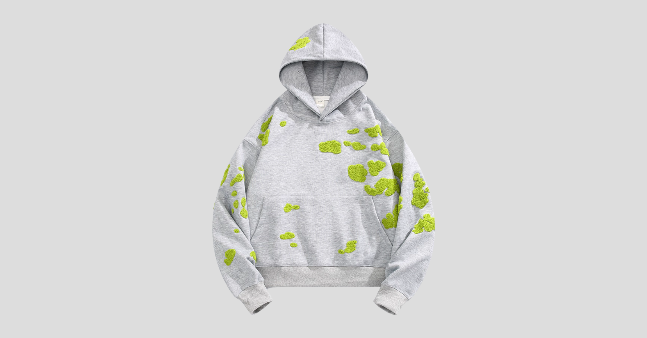 The Moss Hoodie redefines casualwear with textured moss green detailing on a classic grey base. A signature piece for those who value style and comfort.